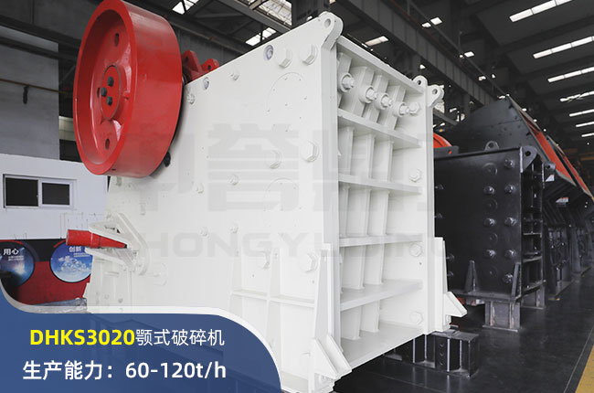 DHKS3020顎式破碎機(jī)進(jìn)料粒度在425mm,出料大小50-120mm,時產(chǎn)量在60-120噸左右,電機(jī)是55kw的,屬于中小型顎式破碎機(jī)。