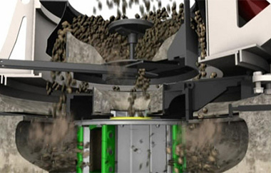 vs碎石整形機工作時,物料由機器上部垂直落入高速旋轉的葉輪內,在高速離心力的作用下,與另一部分以傘狀形式分流在葉輪四周的物料產生高速撞擊破碎,物料在相互撞擊后,又會在葉輪和機殼之間以物料形成渦流多次的互相撞擊,摩擦而粉碎,從下部直通排出,通過篩分設備控制達到所要求的成品粒度。